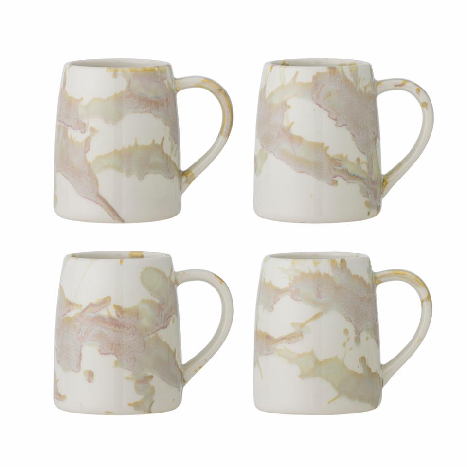 The Winnie Mug by Creative Collection is a set of four stoneware mugs finished with a reactive glaze. Each piece features a soft cream base with flowing patterns in muted rose, beige and light brown. Small variations in pattern and color intensity may occur, making each piece unique