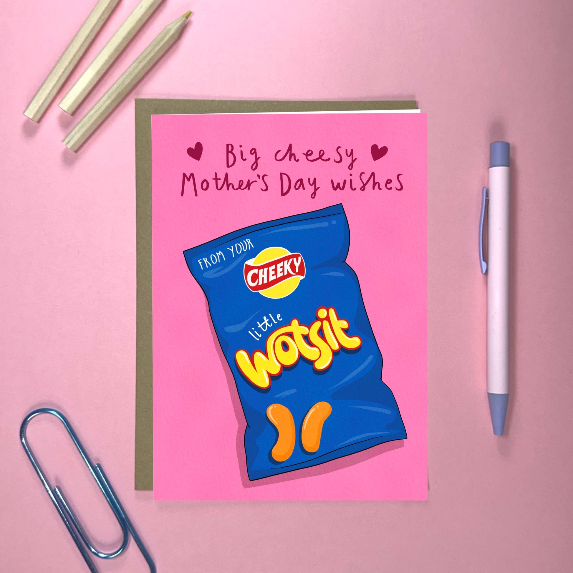 Funny Mother’s Day Card - Cheeky Little Wotsit Cheesy Wishes Designed and printed in the UK. - 127 x 177mm (5 x 7 inches) - Printed on premium high 350gsm, lightly textured card stock - Blank inside - Supplied with Kraft envelope