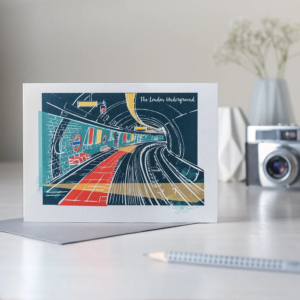 A beautiful London inspired blank art card illustrated by Jill White. This design depicts the iconic London Tube.
