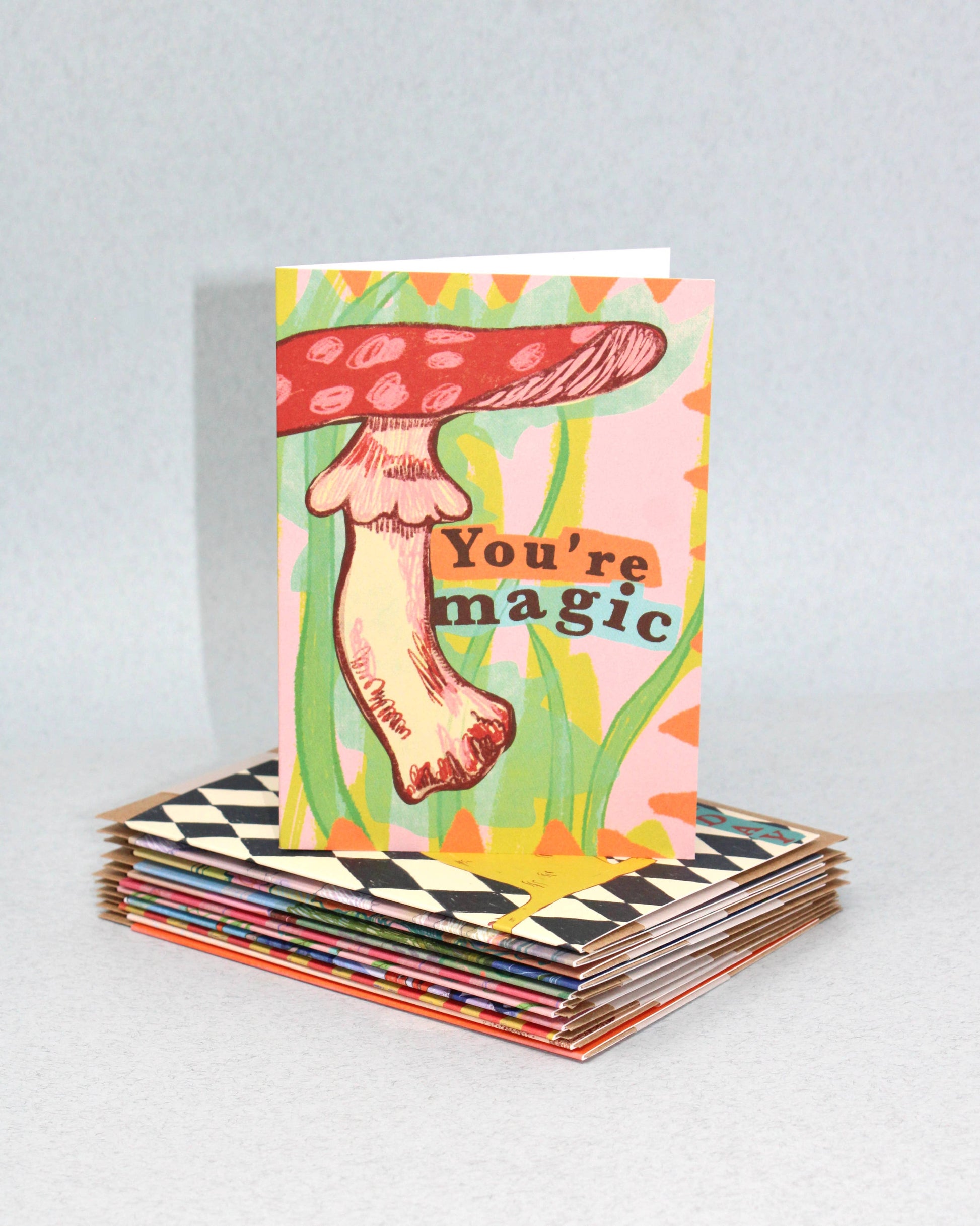 Reintroducing our 'You're Magic Greetings Card', featuring an original narrative illustration of our beloved mushroom design. Enjoy the one-of-a-kind artwork on both the front and back of this card. Perfect for any occasion, this card is sure to impress with its unique and creative design.